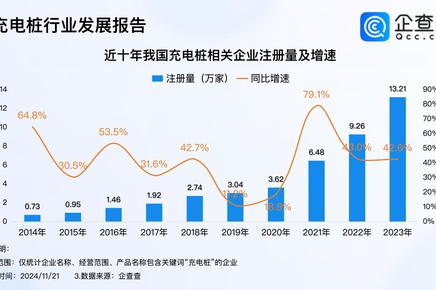 企查查数据显示,从2021年开始,我国充电桩相关企业注册量增速加快,2023年,相关企业注册量同比增加42.6%至13.2万家,创近十年注册量新高。2024 11/11 07:24 -- 来源: 青岛晚报