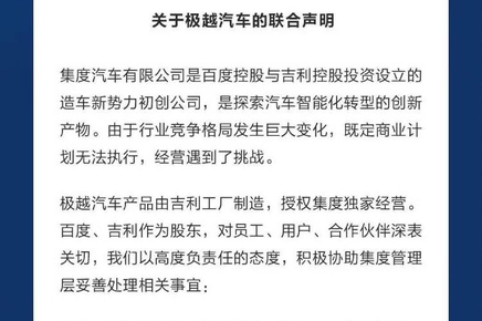 上述联合声明显示,集度汽车有限公司是百度控股与吉利控股投资设立的造车新势力初创公司,是探索汽车智能化转型的创新产物。由于行业竞争格局发生巨大变化,既定商业计划无法执行,经营遇到了挑战。2024 11/25 14:54 -- 来源: 澎湃新闻