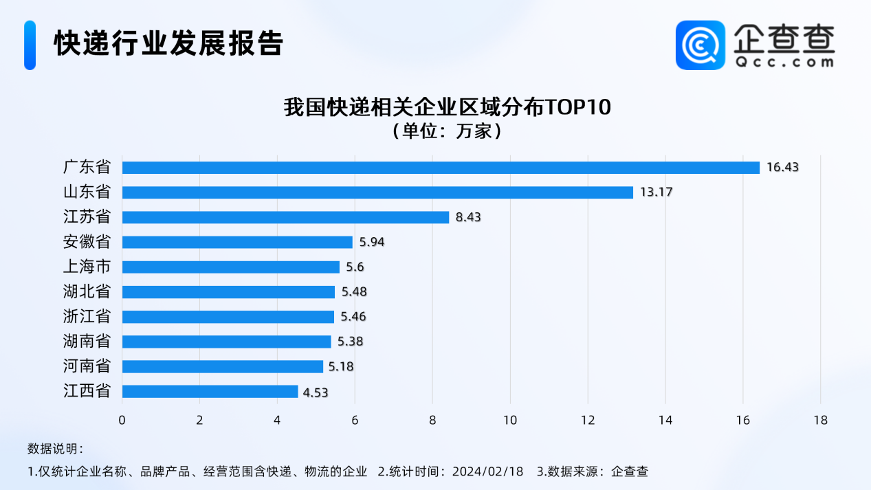 企查查数据显示,从区域来看,广东现存16.43万家快递相关企业,位居第一。山东紧随其后,现存13.17万家快递相关企业,位居第二。江苏现存8.43万家快递相关企业,位居第三。此后是安徽、上海等地。