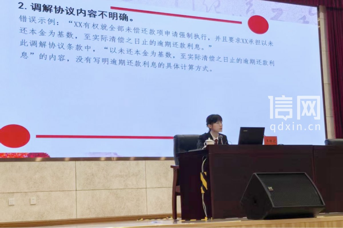 培训现场,徐雯以“从示范性裁判谈批量化调解及注意事项”为题,结合审判实践经验开展系统讲解,详细介绍了“示范性裁判与批量化调解”结合运用的重要作用,深度剖析相关政策及典型案例,并分享了金融纠纷调解的实用技巧,提供了兼具针对性与可行性的实践指引。王姝文围绕“司法确认的流程及相关注意事项”进行了分享,详细讲解了金融案件办理过程中存在的问题及处理方法,为调解员高质高效开展调解工作提出意见建议。