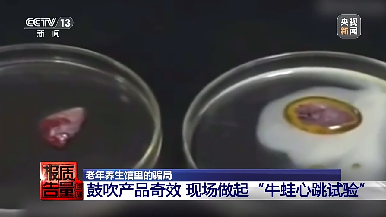 据陈大妈回忆,为了让老人们相信他们的产品能治心脏病,养生馆的讲师在现场还进行了所谓的牛蛙心跳试验——讲师将两颗解剖后的活体牛蛙心脏取出后,分别放在两个容器中,然后向其中一个容器滴入所谓含有保健品成分的试剂,未滴入试剂的牛蛙心脏不久后便停止了跳动,而滴过试剂的牛蛙心脏仍能维持心跳。
