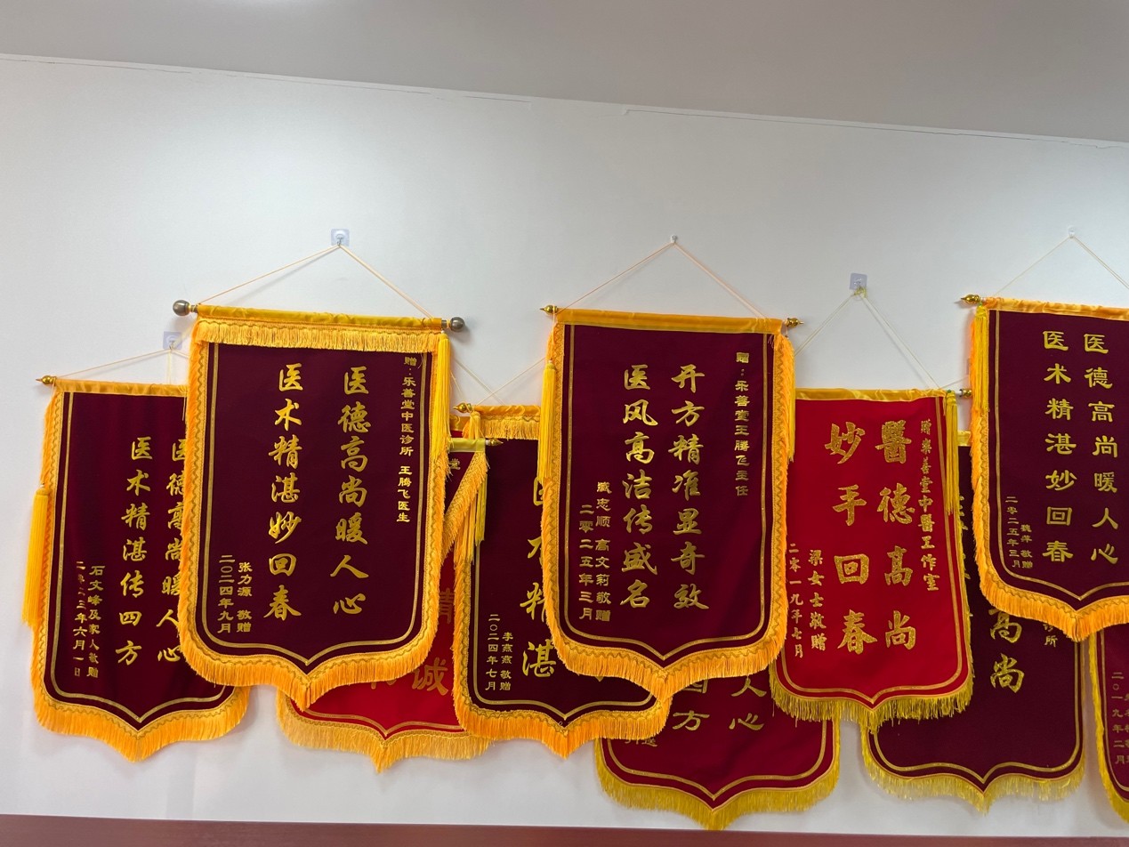 “不知道是哪位患者,在诊所门口放了两箱鸡蛋就匆匆走了,还有送瓜果蔬菜的。”王腾飞笑着说,这些淳朴的善意常让他心里暖暖的,这种有人情味的诊疗,在乐善堂化作墙上的10余面锦旗。王腾飞格外珍视患者的口碑:“当莱西、日照等郊区和外市的患者驱车几百公里专程前来就诊,我就知道我的非遗传承真正接地气了。”