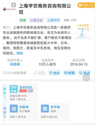 中证君在天眼查搜索发现,以“徐勤根”为企业法人或高管的公司中,符合金融、外汇等服务范畴、仍在存续的只有一家公司,名为上海亨世商务咨询有限公司。该公司注册资本为10万元,成立于2016年,徐勤根担任企业法人及执行董事。此“徐勤根”是否就是网上走红的徐勤根,尚有待确认。