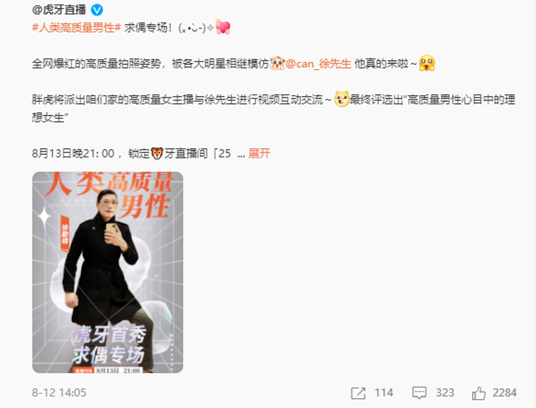 翻看其微博内容可以发现,徐勤根这种极具“另类”走红的方式已经获得了不少品牌方和平台的青睐。在徐勤根展示的个人微博中,其本人已经为哈尔滨啤酒拍摄了相关广告视频,“虎牙”平台甚至为其开设一场“求偶专场”直播。