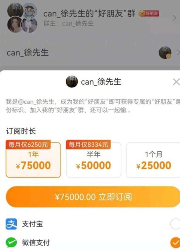 日前,有网友发现,徐勤根使用的微博账号@can_徐先生,开通了微博V+会员功能。如果想要进入他的粉丝群,每人每年的费用为7.5万元,半年的费用为5万元,1个月的费用高达2.5万元。