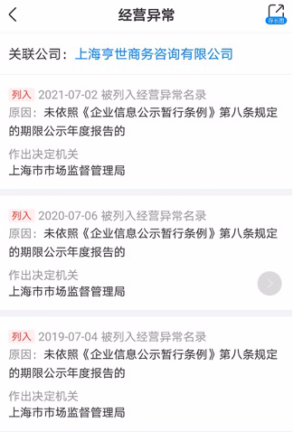 同时,上海亨世商务咨询有限公司因未依照相关规定的期限公示年度报告,已经连续3年被上海市市场监督管理局列入经营异常名单。