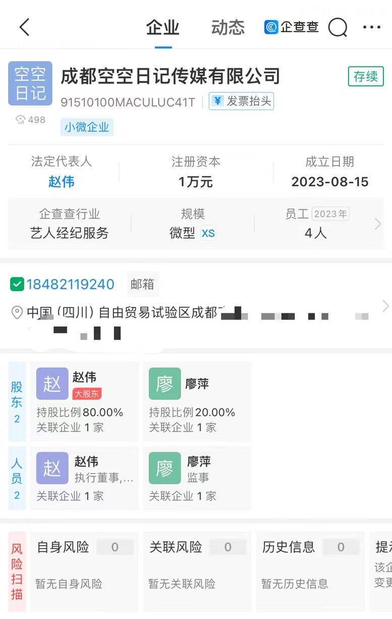 据第三方数据显示,空空日记某平台当前粉丝数为272.8万,对比其7月塌房曝光前的550万粉,已掉粉超277万。商业化水平显示其21-60s视频报价20万,60+视频报价25万。当前,其关联MCN为桃子星球,查询企查查发现,该关联公司为桃子星球文化传播有限公司,成立于2019年10月,注册资本100万元,廖萍为法定代表人并持股90%,廖萍另关联一成都空空日记传媒有限公司,持有20%股份并担任监事职务。(信网记者)