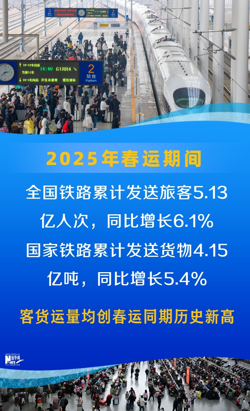 为期40天的2025年铁路春运圆满收官。春运期间,全国铁路累计发送旅客5.13亿人次,同比增长6.1%,国家铁路累计发送货物4.15亿吨,同比增长5.4%,客货运量均创春运同期历史新高。