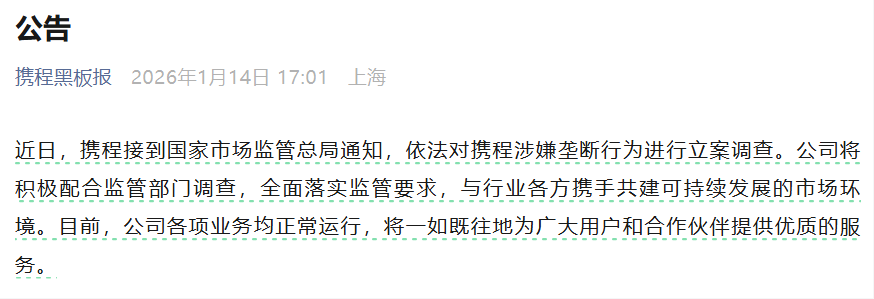 信网1月14日讯 14日,携程黑板报微信公众号发布《公告》,就“携程集团有限公司涉嫌滥用市场支配地位实施垄断行为立案调查”回应。