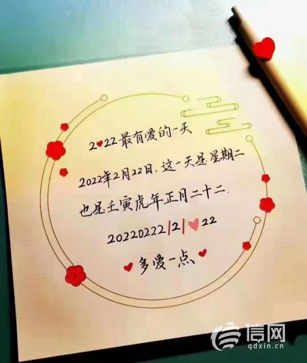 西海岸新区民政局工作人员表示,“新人们给9个2赋予了美好的寓意‘长长久久、爱意满满’,很多人选择这一天和心爱的人永结同心一生一世一双人,毕竟下一个多“爱”要等200年呢!”