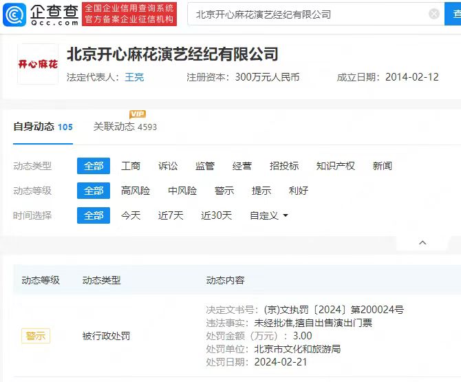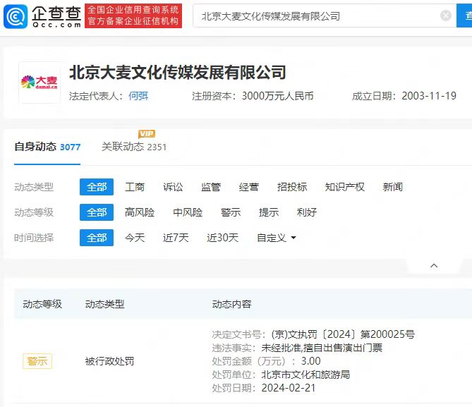信网2月26日讯 企查查显示,近日,北京猫眼文化传媒有限公司、北京开心麻花演艺经纪有限公司、北京大麦文化传媒发展有限公司均因未经批准,擅自出售演出门票被罚款3万元人民币。(信网记者)