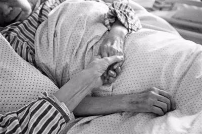 8时许,女儿把林生华推进母亲的病房,两张病床靠在了一起,两个分别40天的老人头挨头,手牵手。