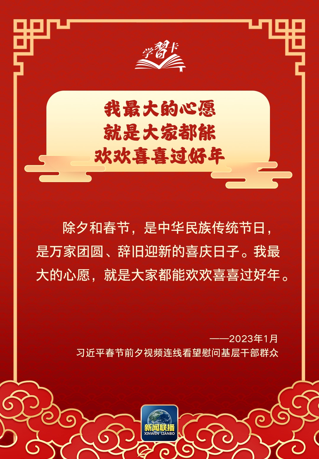 习近平总书记曾说:“我最大的心愿,就是大家都能欢欢喜喜过好年。”在这辞旧迎新、万家团圆之际,让我们聆听总书记的暖心话语,一起学习↓