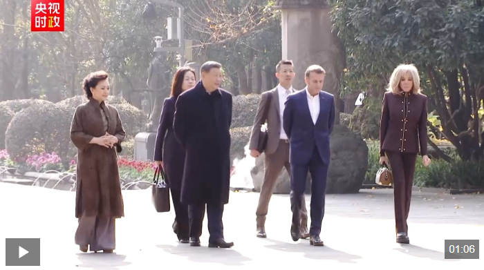 初冬的都江堰,苍山掩翠。马克龙夫妇抵达时,受到习近平和彭丽媛热情迎接。两国元首夫妇沿堰功道边走边谈。习近平介绍都江堰历史和意义,指出都江堰水利工程是全世界迄今唯一仍在使用的古代水利工程,也是人类与自然和谐共生最早的成功实践之一,修建过程充分反映了中华民族自强不息、不畏艰难、勇于开拓的精神。两国元首夫妇落座怀古亭,临水品茗,纵论天下。