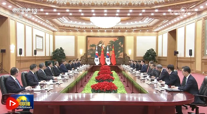 习近平指出,当前世界百年变局加速演进,国际形势更加变乱交织。中韩在维护地区和平、促进全球发展方面肩负重要责任,有广泛利益交集,应当坚定站在历史正确一边,作出正确战略选择。80多年前,中韩两国付出巨大民族牺牲,赢得抗击日本军国主义的胜利。今天更应携手捍卫二战胜利成果,守护东北亚和平稳定。作为经济全球化的受益者,中韩要共同反对保护主义,践行真正的多边主义,为推进平等有序的世界多极化、普惠包容的经济全球化作出贡献。