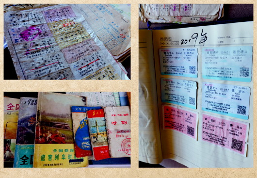 这些车票有大有小,有薄有厚,有红色的、白色的、蓝色的,按照年代的先后顺序,被整齐地贴在笔记本里,泛黄的纸页记载着老人60年来的一段段往事。