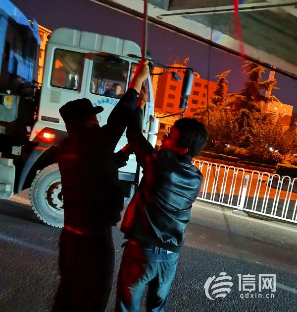 接警后,平安路派出所110警车立即赶赴现场。到达现场后,民警孙曙光发现一根由多根电线捆绑在一起的十几厘米粗的电缆悬垂在桥底的正中央,事故现场临近港口,大货车较多,已经出现路堵情况,而且电缆可能带电,非常危险,孙曙光立刻将现场情况报送给指挥中心,联系相关部门前来处理。