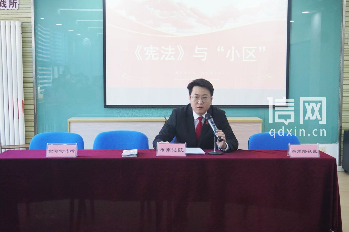 12月3日,市南法院联合金湖路街道泰州路社区、金湖路司法所共同举办“宪法宣讲进社区”活动。