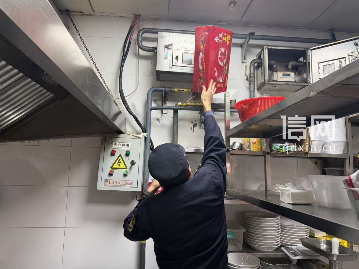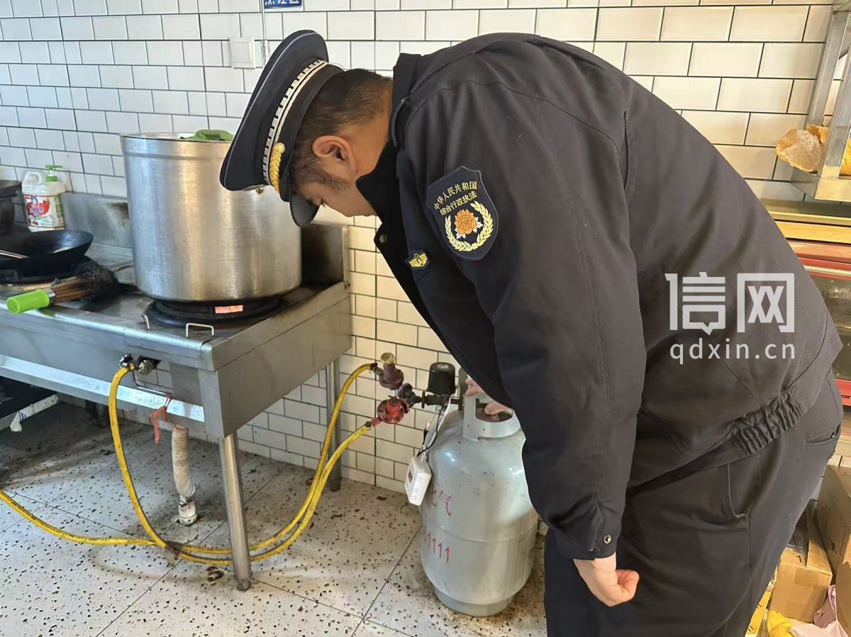 市容环境执法中队深入沿街餐饮经营场所、商业美食区等重点区域,逐户排查燃气管道连接、报警装置运行及燃气设施周边环境等情况,同时提醒经营商户加强日常管理,确保用气安全。检查中,执法人员发现某餐饮店在燃气管道悬挂物品的违规行为,现场责令当事人立即整改,及时消除安全隐患。