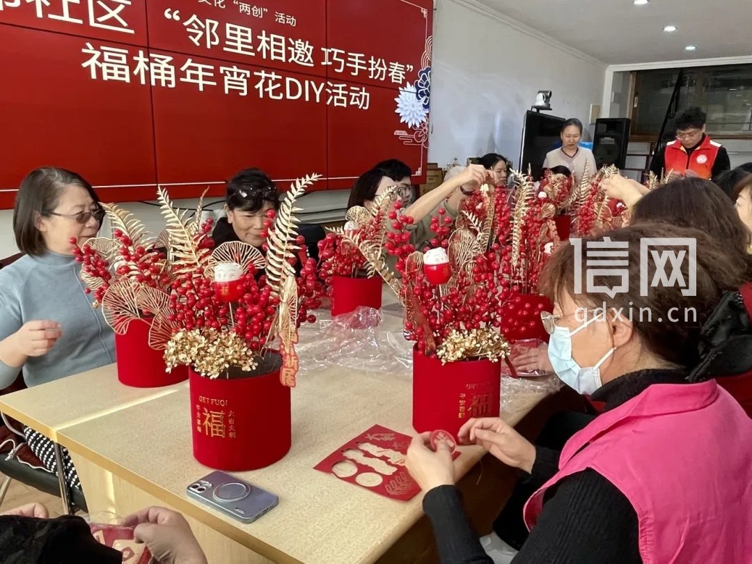 在凯都社区,“邻里相邀 巧手扮春”福桶年宵花DIY活动现场一片欢声笑语。居民们在志愿者指导下,巧手搭配花材、装点饰品、挂上祝福,一个个红艳艳、寓意吉祥的福桶在手中诞生。“新年第一个福桶安排上啦!2026年大吉大利,红红火火。”李女士的喜悦之情溢于言表。这亲手制作的“年味”,不仅是家庭装饰,更是对美好生活的祈愿和邻里间情感的联结。