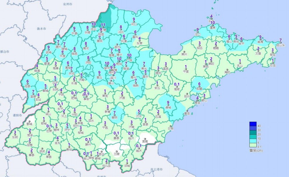全省大部地区出现明显积雪 ,最大积雪深度为11厘米,出现在无棣。