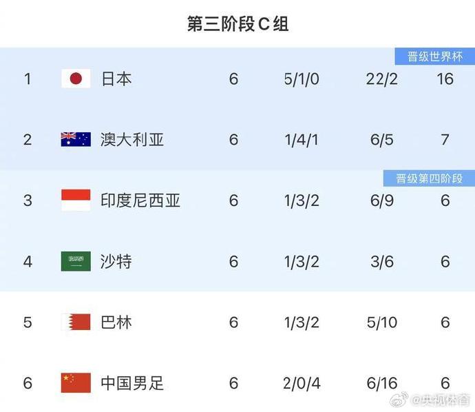 6轮过后,C组呈现大乱斗局面。日本积16分遥遥领先,澳大利亚积7分排名第二,印尼、沙特、巴林和国足同积6分,国足因净胜球劣势排名垫底。