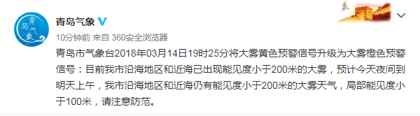 信网3月14日讯 青岛市气象台2018年03月14日19时25分将大雾黄色预警信号升级为大雾橙色预警信号:目前我市沿海地区和近海已出现能见度小于200米的大雾,预计今天夜间到明天上午,我市沿海地区和近海仍有能见度小于200米的大雾天气,局部能见度小于100米,请注意防范。