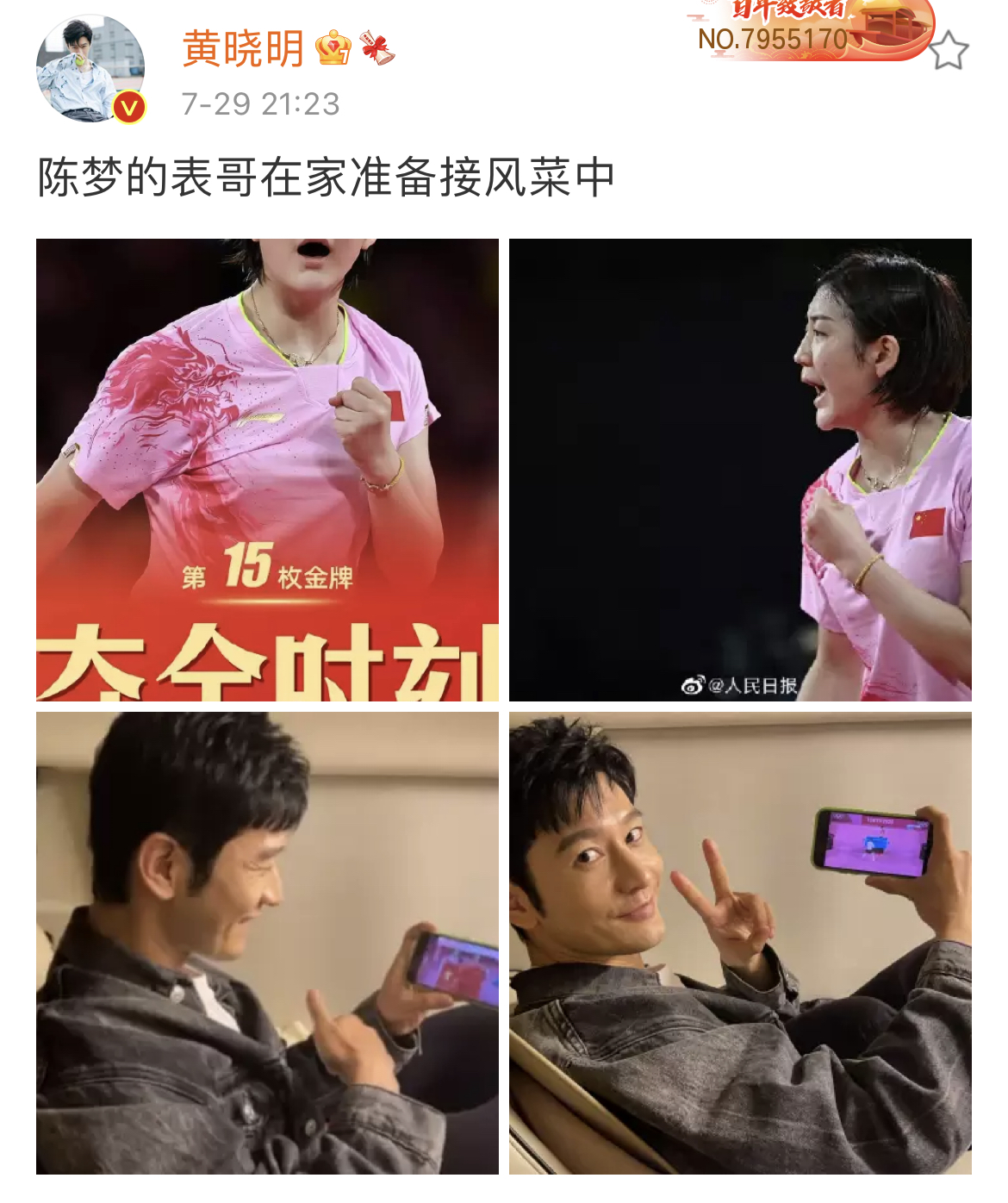 信网7月29日讯 陈梦获得东京奥运会乒乓球女子单打比赛冠军后,黄晓明第一时间送上祝福,并“官宣”他确实是陈梦的表哥:“陈梦的表哥在家准备接风菜中”。