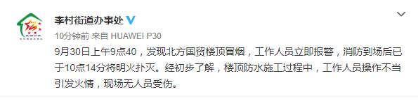 信网9月30日讯 据李村街道办事处官方微博消息,9月30日上午9点40,发现北方国贸楼顶冒烟,工作人员立即报警,消防到场后已于10点14分将明火扑灭。经初步了解,楼顶防水施工过程中,工作人员操作不当引发火情,现场无人员受伤。