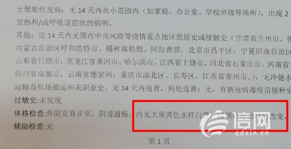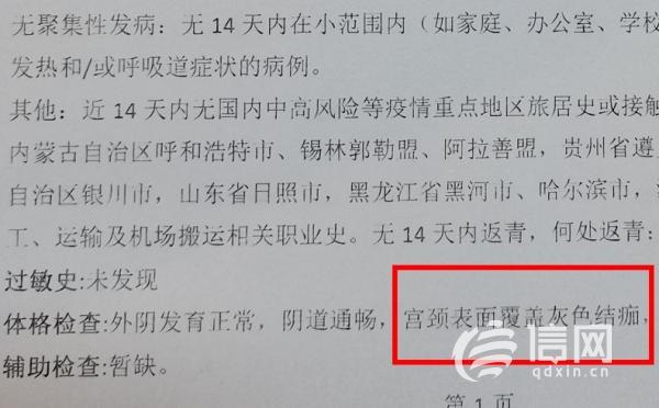 王女士表示,她做的HPV宫颈癌筛查、TCT、激素等检查都在11月2日才出结果,但医生在10月30日当天就给她做了贴膜手术。术后,王女士身体出现出血和分泌物异常的问题,不能放心的她又在11月1日到三甲医院重新查体。三甲医院的检查报告显示,王女士的宫颈表面覆盖灰色结痂,内见大量黄色水样白带,是在宫颈物理治疗后发生的改变。