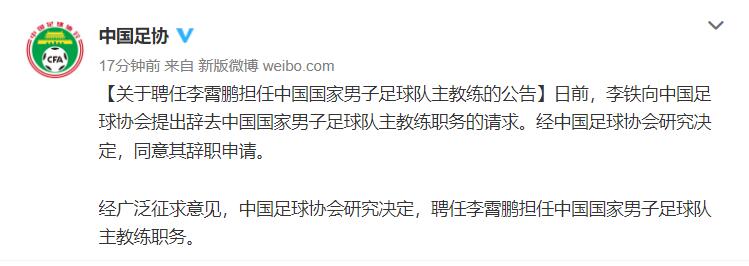经广泛征求意见,中国足球协会研究决定,聘任李霄鹏担任中国国家男子足球队主教练职务。