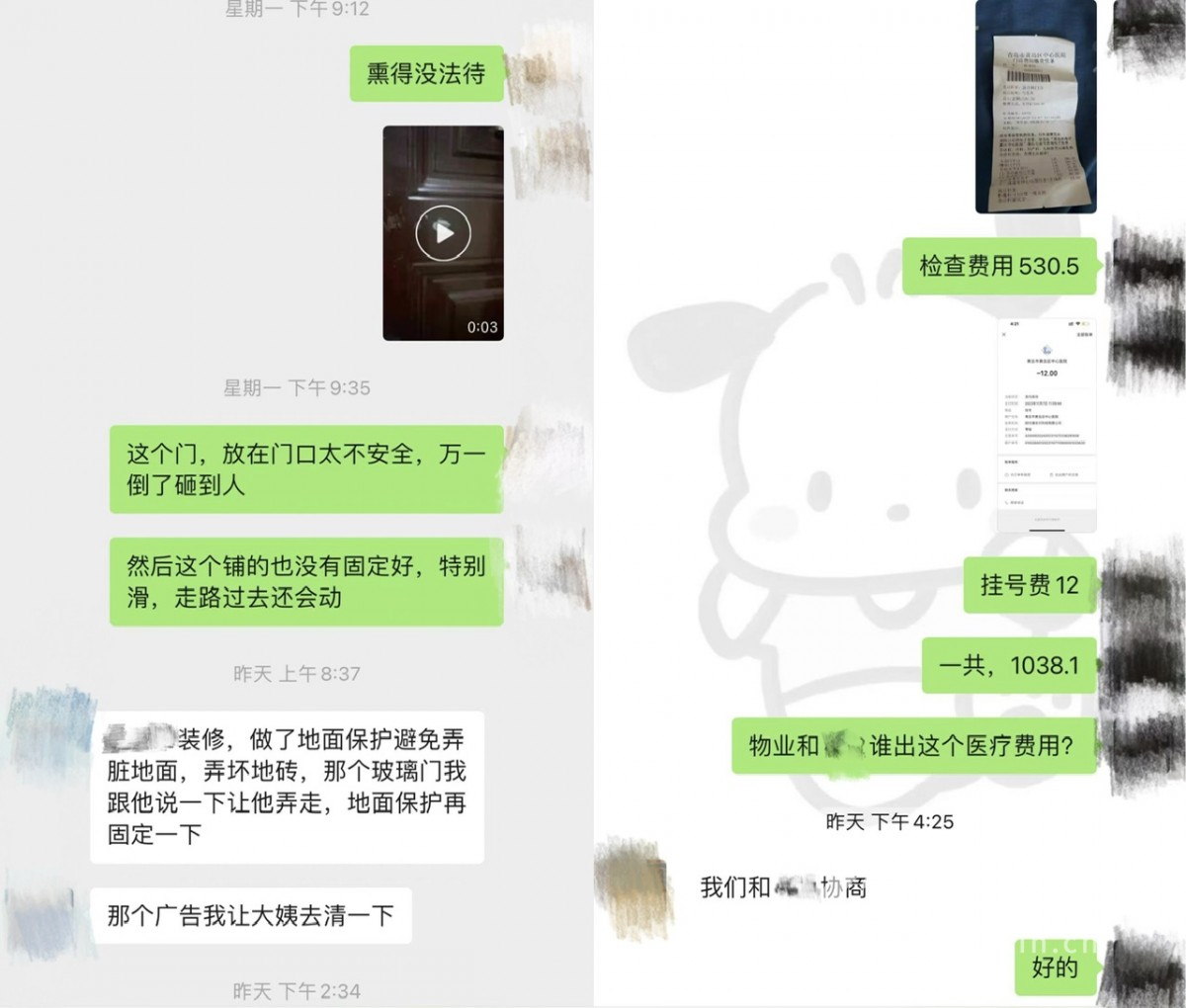 一出门就摔跤,这看似是个意外,但这个隐患陈女士前一天就发现了。原来,陈女士的邻居最近正在装修,前一天把几扇玻璃门搬到了走廊里,为了防止磨损地面和门,装修工人特意在地上铺了一层防护布,但却并未将防护布完全固定在地面上。“防护布是像塑料编织袋的那种材质,走廊铺的是瓷砖,不固定好的话就会打滑。”6日晚上九点多,陈女士把自己的担心发给了物业管家,第二天早上管家答复会提醒邻居尽快搬走玻璃门,并且把保护地面的防护布固定好。可还没等邻居有行动,陈女士就先摔了跤。