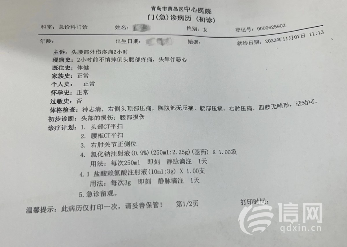11月7日上午,陈女士刚出家门,踩在了邻居家铺在走廊的防护布上,直接一个趔趄往后倒去,摔倒时头部着地,“虽然去医院拍了CT没啥大问题,但是我一直觉得头晕,还撞到了腰和胳膊肘,也一直疼。”