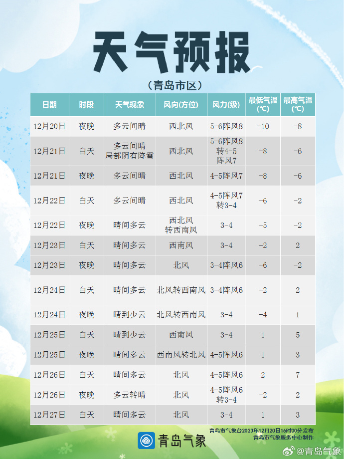 预计今天夜间,青岛市多云间晴,北部地区阴有阵雪,西北风5到6级阵风8级,全市最低气温-12~-10℃。明天白天,青岛市多云间晴,北部地区有小雪局部中雪,南部局部地区有阵雪,西北风5到6级阵风8级,傍晚减弱至4到5级阵风7级,全市最高气温-7~-5℃。