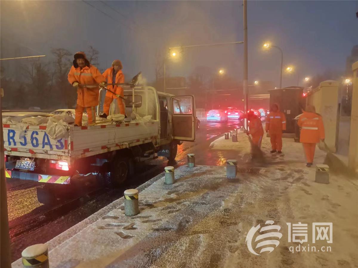 突如其来的降雪伴随气温降低,在主要交通路口、主次干道、上坡路段等,机动车、非机动车出现打滑、溜车等现象,严重影响市民出行回家。省级文明单位市北区城市管理局紧急调度聚泰城市服务集团所属的市政、环卫、绿化一、二公司等市级文明单位,实施专业化和社会化相结合的工作模式,三个行业六支主力清雪防滑队伍连夜奋战,在主次干道播撒液体、固体融雪剂370余吨,轮番作业、边下边清,实现2月5日早晨道路畅通。