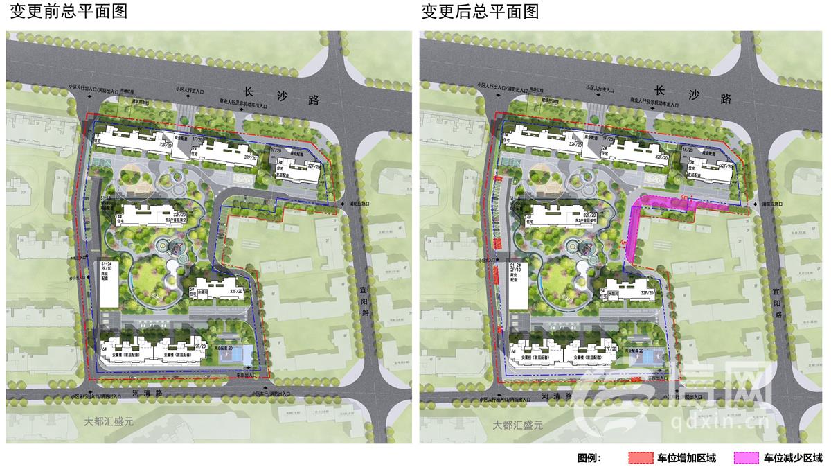 3、取消居住区内地面机动车停车位36个;河清路沿街增加1个停车位,规划路沿街增加7个停车位,并调整沿街商铺停车场出入口宽度;地下车库停车位增加28个。