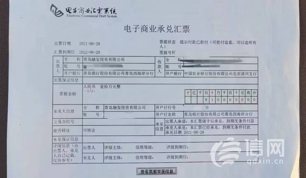 信网8月29日讯(记者 王梦婷)“融创集团票据违约两年多了,法院都判决了还不支付,我们小微企业都要经营不下去了 ,真不知道该怎么办。”近日,王先生向信网(热线0532-80889431)反映,青岛融玺投资有限公司(以下简称“融玺”)使用电子承兑汇票作为支付手段,在约定的支付期限届满后,却拒付承兑汇票,甚至法院判决支付后依然未履行判决结果,导致小微企业生产经营陷入困境。