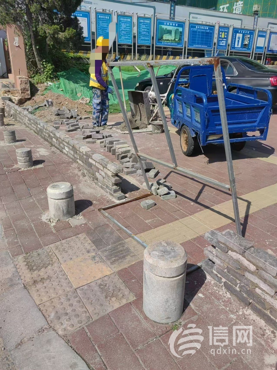 值得注意的是,这段人行道上还设有盲道,但现在也因被占用而形同虚设。在现场,信网也没有看到占用道路的施工许可。