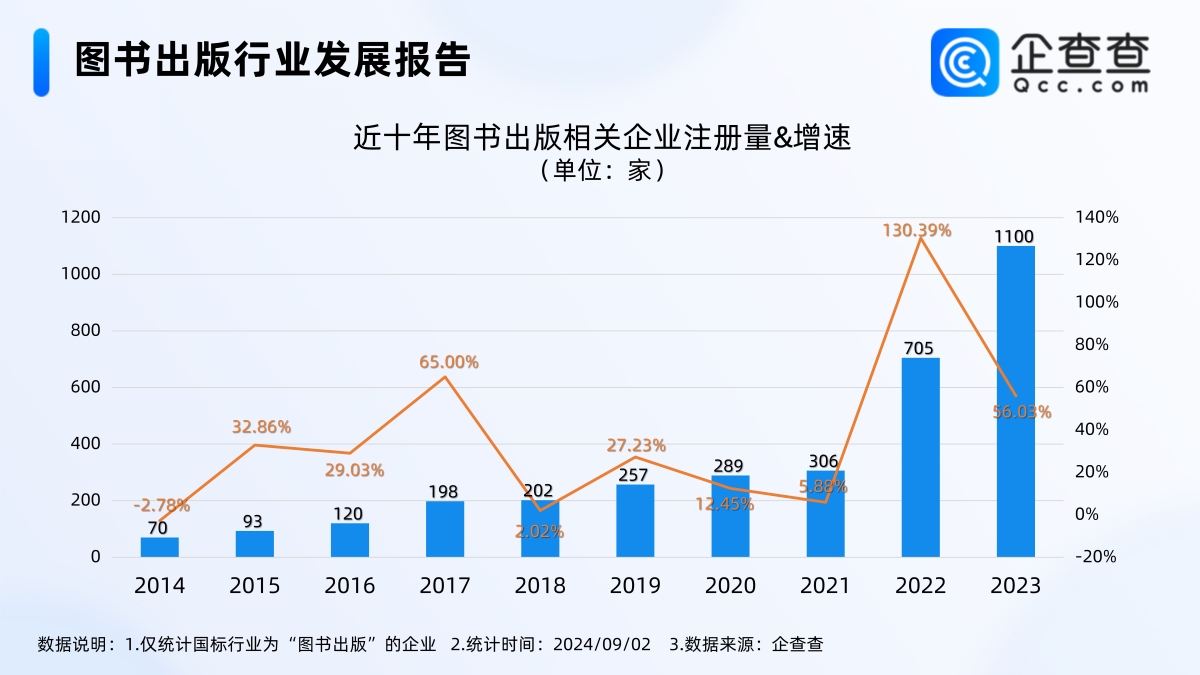 企查查数据显示,国内现存图书出版相关企业3703家,近十年相关企业注册量呈现整体增长态势。2022年、2023年每年注册量分别同比增长130.39%、56.03%至705家、1100家。今年前8月已注册307家,低于去年同期注册水平。