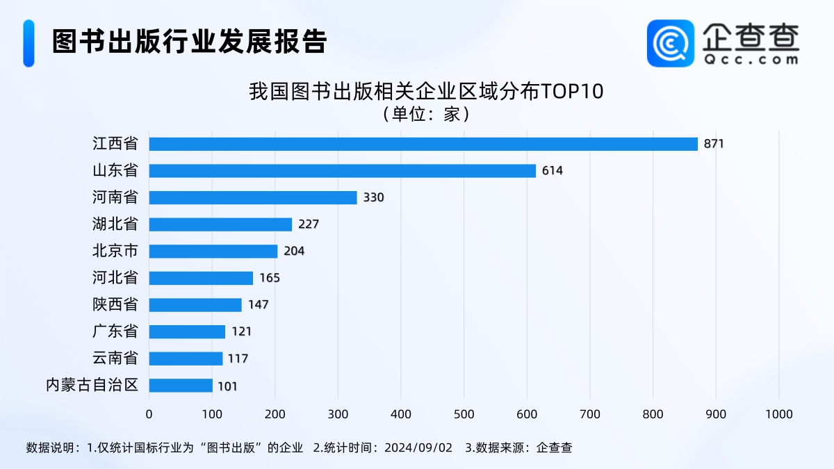 企查查数据显示,从区域来看,江西现存871家图书出版相关企业,居全国首位。山东、河南分别现存614家、330家图书出版相关企业,居全国前三。此后是湖北、北京、河北等地。