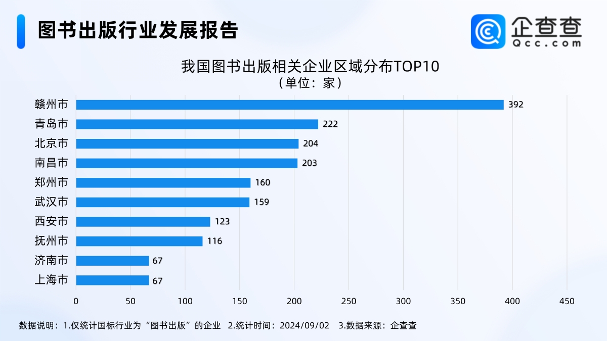 企查查数据显示,从城市来看,赣州现存392家图书出版相关企业,居全国首位。青岛、北京分别现存222家、204家图书出版相关企业,居全国前三。此后是南昌、郑州、武汉等地。(信网记者)