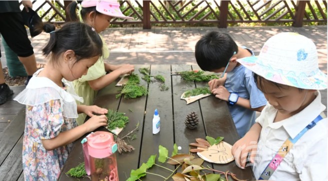 “环保创意工坊”活动中,孩子们在园林老师的带领下,观察各类花卉植物,了解生态系统及其保护的重要性,并动手利用自然材料进行创作,实现了“变废为宝”的环保理念。