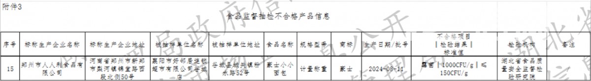 根据湖北省市场监督管理局的公告显示,被抽检的“豪士小小面包”(2024-08-11)由襄阳市一连锁超市销售,生产厂家是郑州市人人利食品有限公司,其霉菌检测值为1000CFU/g。而《食品安全国家标准糕点、面包》(GB 7099-2015) 的规定,糕点和面包中霉菌最大限量应不超过150CFU/g。据这一结果显示,该批次“豪士小小面包”霉菌含量超标近6倍,严重超出了食品安全的允许范围。