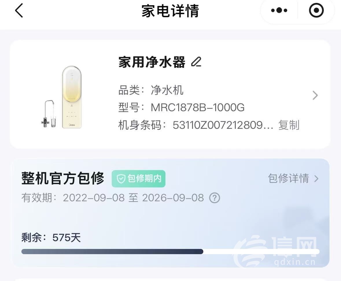 2022年9月,王女士在淘宝的美的净水官方旗舰店买了一台MRC1878 - 1000G的家用净水器,花费2700元。根据美的服务小程序显示,该净水器整机官方保修有效期为2022年9月8日至2026年9月8日,目前尚在保质期内。