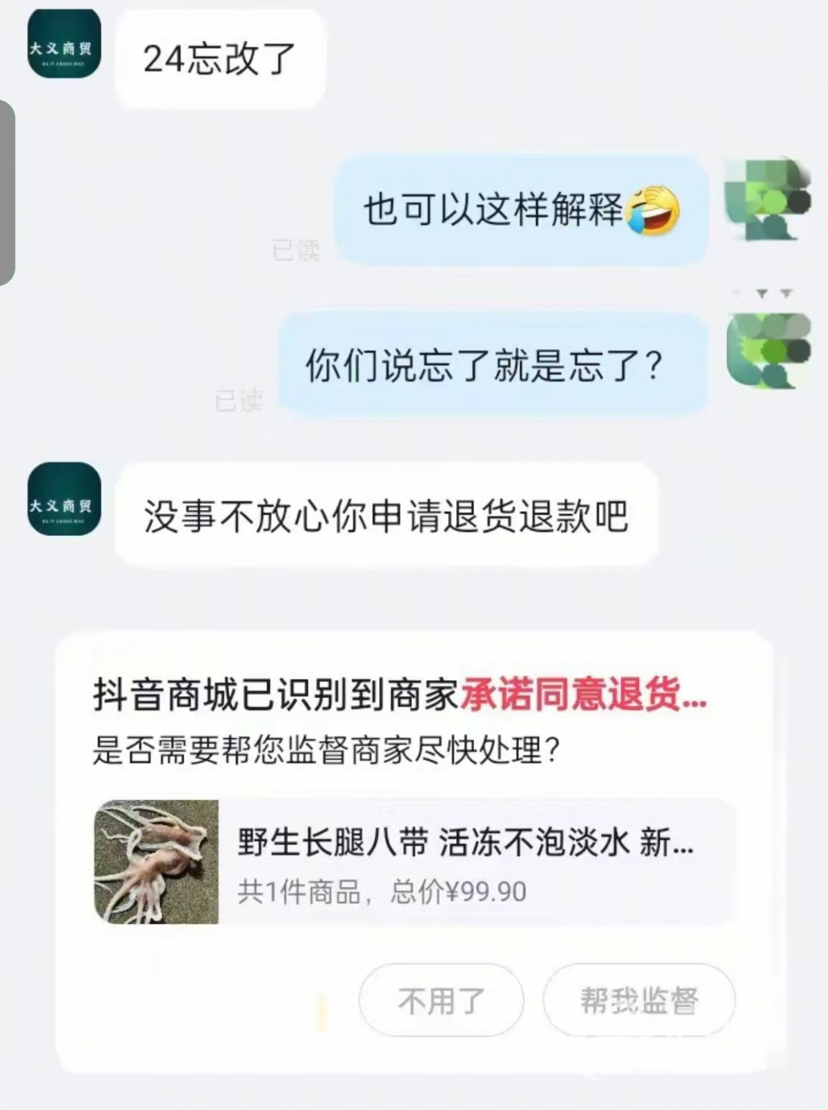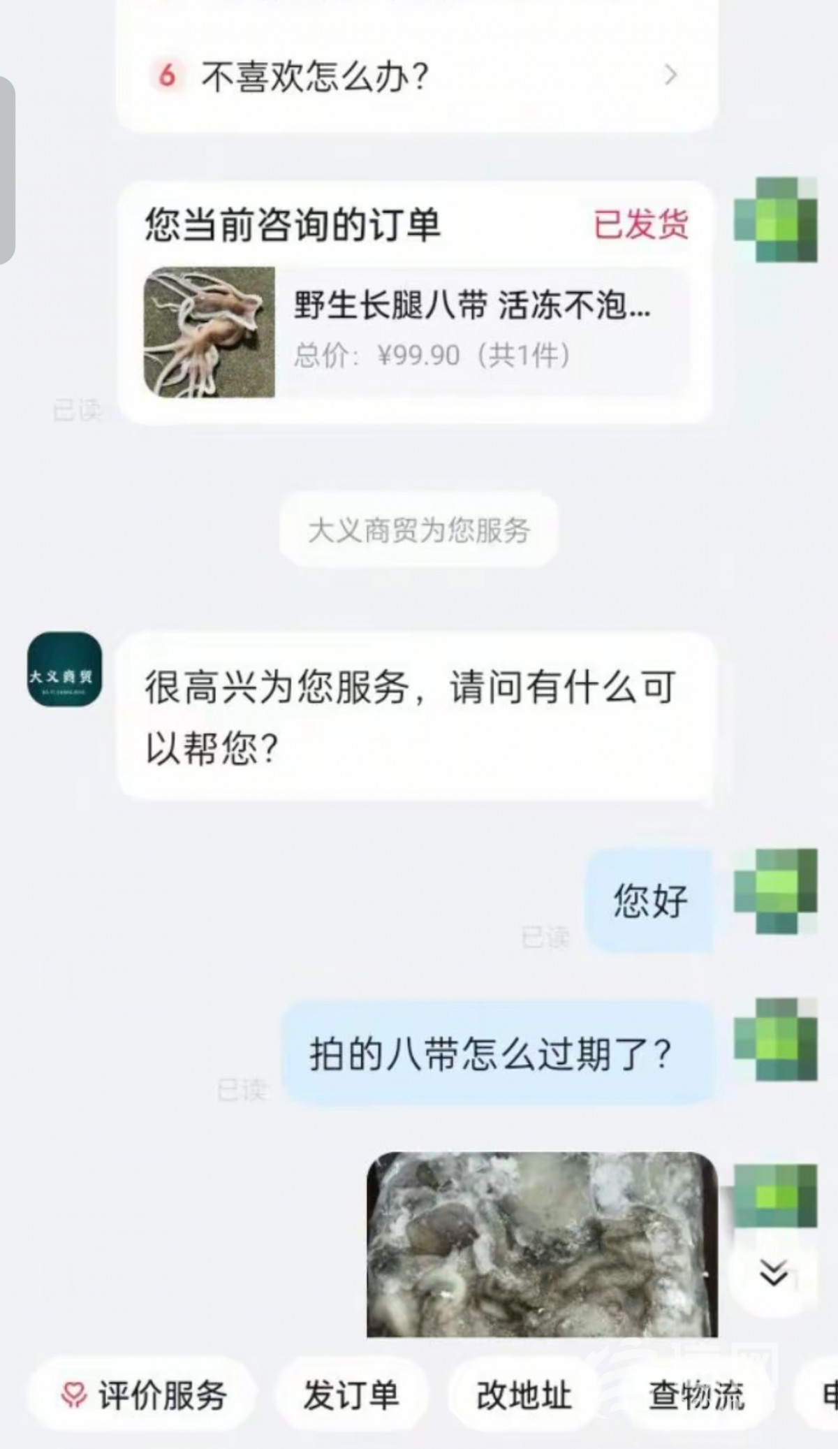 “求大家支支招,怎么治治这个商家?”日前,有网友在个人社交平台爆料称,他在某短视频平台一家名为大义商贸的店铺内,花费99.9元购买了10斤装的冰冻八带。2025年1月24日,该网友收到货品后发现,产品包装上标注的生产日期为2024年1月15日,保质期为1年,这意味着该产品已过保质期。发现问题后,该网友立即联系商家。商家回应称是标签打印错误,实际生产日期为2025年1月15日,产品并未过期,同时表示由于自身疏忽,愿意退还99.9元购物款。但该消费者并未接受商家提出的解决方案。