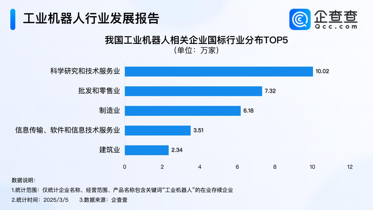 企查查数据显示,我国现存32.3万家工业机器人相关企业,行业分布上,归属科学研究和技术服务业的企业最多,有10.02万家,占比31.1%;其次是归属批发和零售业的企业,有7.32万家,占比22.7%;归属制造业的企业有6.18万家,占比19.1%。