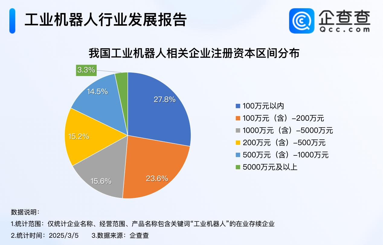 企查查数据显示,公示注册资本的现存工业机器人相关企业中,注册资本在100万元以内的企业最多,占比27.8%,其次是注册资本在100万元-200万元的企业,占比23.6%,注册资本在1000万元-5000万元的企业占比15.6%。综合来看,我国工业机器人相关企业注册资本以200万元以内为主,合计占比51.3%。(信网记者)
