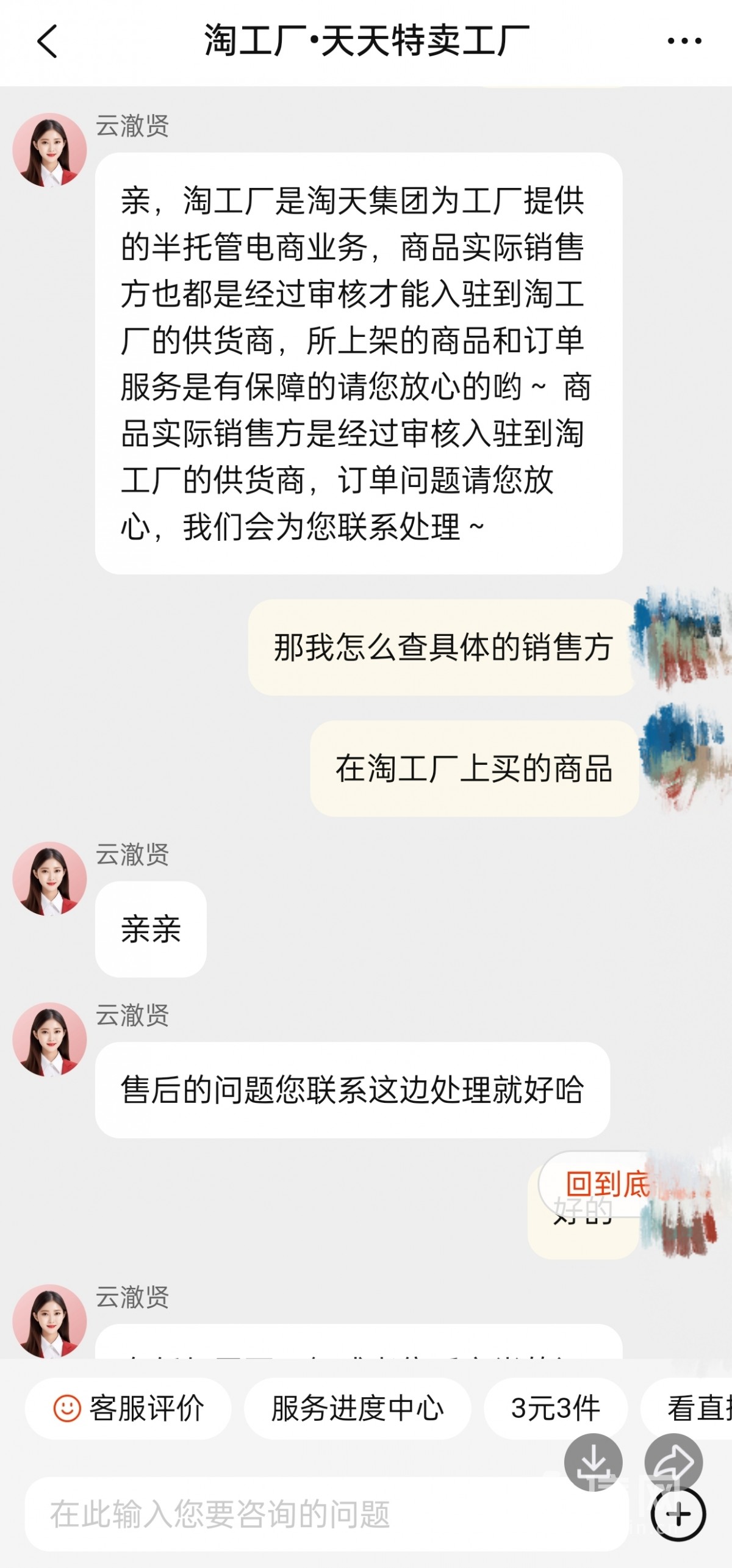 “淘工厂作为淘宝平台的运营渠道,客服却连商品的具体销售方是谁都不知道。”据王先生介绍,由于从商品购买链接处无法直接获取具体的商家信息,自己曾向淘工厂客服询问该充电宝的实际销售方,但对方却屡次表示“实际销售我们不清楚”“售后问题您联系这边处理就好”“商品实际销售方是经过审核入驻到淘工厂的供货商,所上架的商品和订单服务是有保障的”等答复,这无疑也给王先生的维权行为带来了一定阻碍。