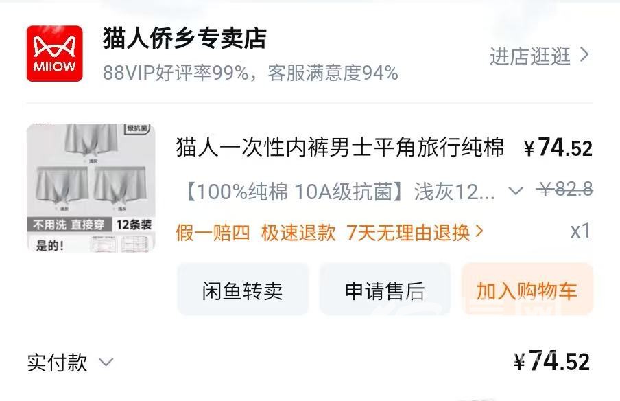 张先生是在天猫平台“猫人侨乡专卖店”购买的一次性内裤,12条一共花了74.52元。下单前,他还特别注意到店铺综合体验达5星,宝贝质量、服务保障评分均为5.0,而且这款男士平角旅行纯棉内裤宣传“100%纯棉10A级抗菌”。