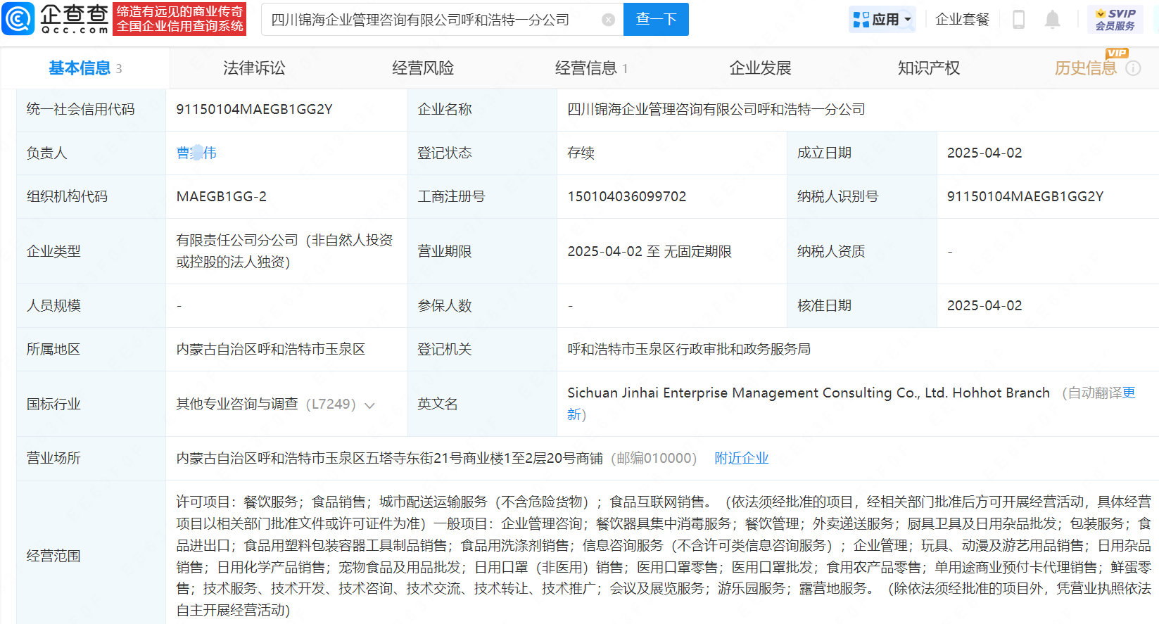 企查查显示,涉事门店成立于2025年4月,负责人为曹某伟,经营范围包含餐饮服务、食品销售、城市配送运输服务、食品互联网销售等。(信网记者)